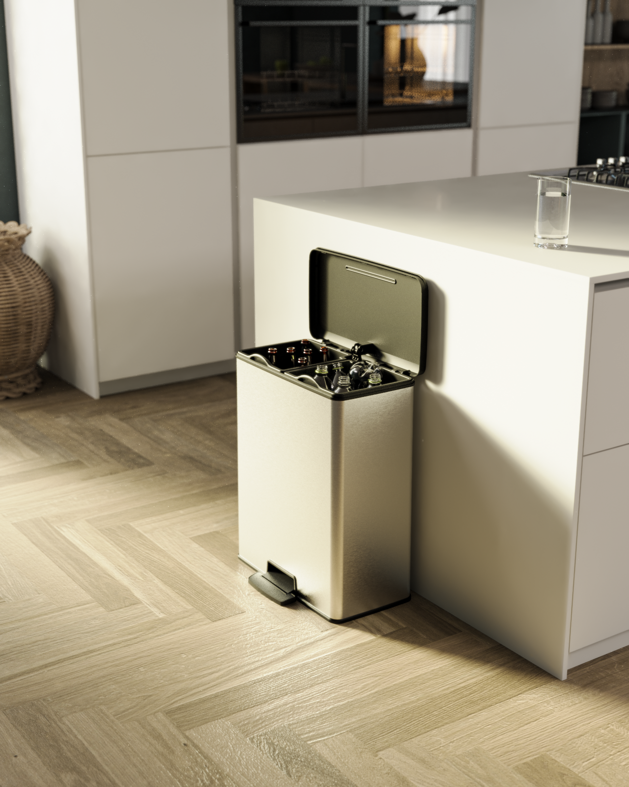 The container is made of at least 70% recycled plastic i.e Resin and is not only environmentally friendly, but also extremely functional, thanks to the lid with a soft closing mechanism and a large pedal, which increases the hygiene of the use of the basket and facilitates its operation.